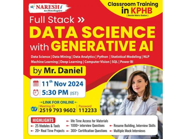 Classroom & Online Training in KPHB Join our Full Stack DATA SCIENCE & AI TrainingRegistration Link: https://shorturl.at/6SOXHNew Batch Details:Date: 11th November 2024Time: 5:30 PM to 7:00 PMMode of Training: Classroom/OnlineNew Batches updates: https://nareshit.com/new-batchesCourse Highlights:• Basic understanding of Python programming.• Familiarity with statistics and mathematics.• Knowledge of data manipulation libraries (e.g., NumPy, Pandas).• Understanding of data visualization techniques.• Basic knowledge of machine learning concepts.• Familiarity with SQL and databases.