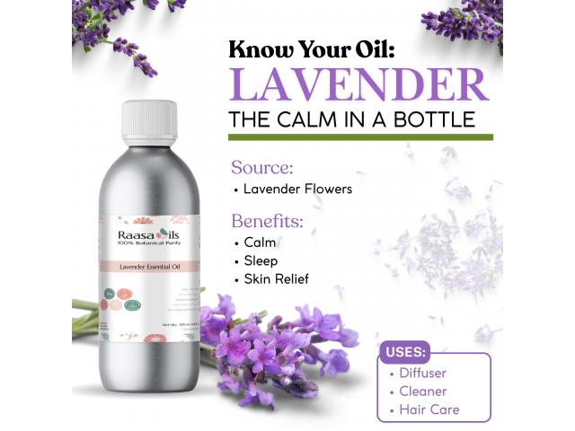 Experience calm and comfort with Raasa Oils Lavender Essential Oil — steam-distilled and pure for deep relaxation, glowing skin, and peaceful sleep. Perfect for aromatherapy, massage, and daily wellness.