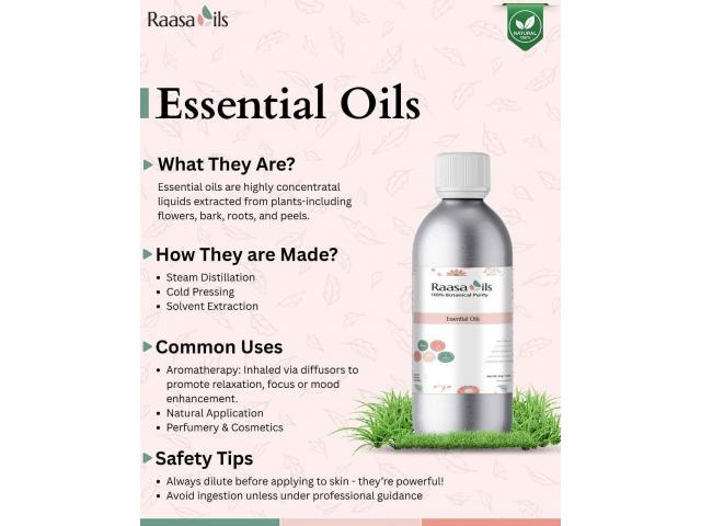 Discover the purity of nature with Raasa Oils Essential Oil, made from high-quality botanicals for natural wellness and relaxation. Ideal for aromatherapy, skincare, and massage, this therapeutic-grade oil offers soothing aroma and holistic benefits for mind and body. Perfect for diffusers, DIY beauty blends, and home use.