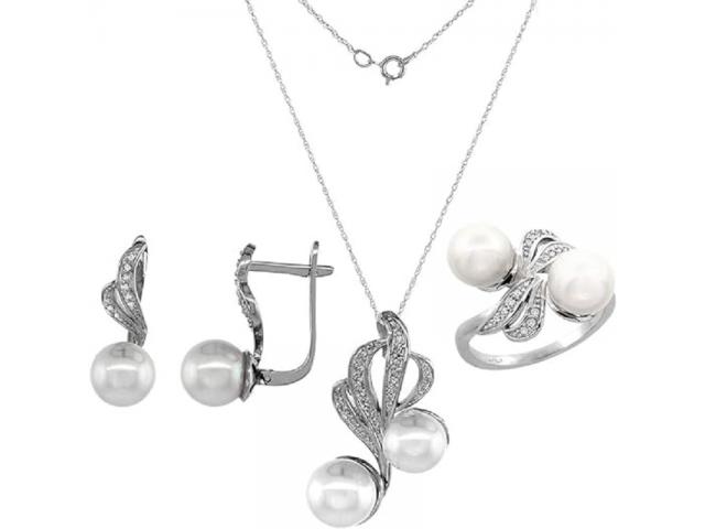 14k White Gold Diamond Round Black Brown Pink White Pearl Earring Necklace