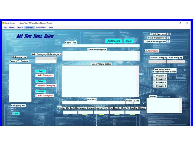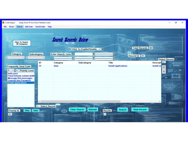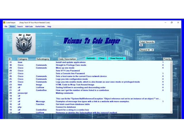 Code Keeper 1.12 is a free program for the use of keeping track of crucial programming code, links, notes, as well as useful needed commands. It allows you to store them in a local database and search and retrieve them whenever needed.