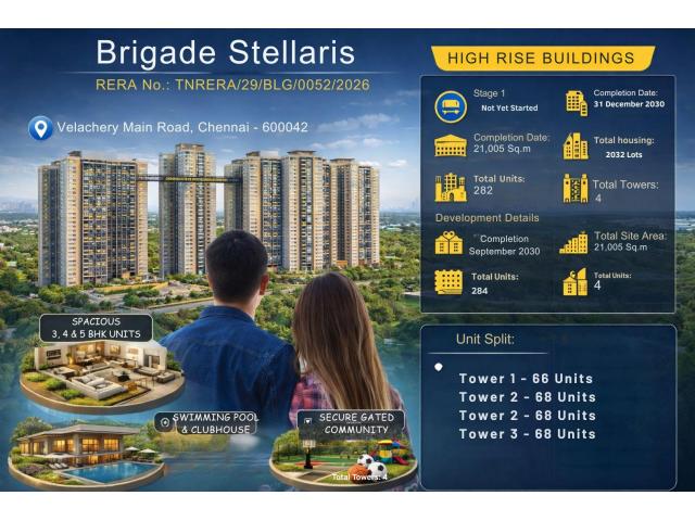 Brigade Stellaris is an upcoming premium residential project on Velachery Main Road, Chennai. Modern high rise towers, thoughtfully designed apartments, and excellent connectivity to IT hubs and city infrastructure make it a promising address for comfortable urban living.