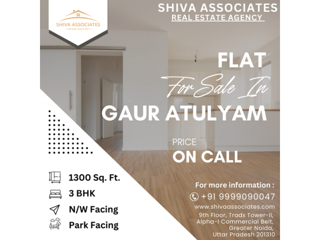 Looking for a spacious 3 BHK flat in a high vicinity? Shiva Associates, your trusted Real Estate Agency in Greater Noida, is supplying a stunning flat for sale in Gaur Atulyam, Omicron 1. This well-maintained flat covers a place of 1300 sq. Ft., featuring three bedrooms, a North-West facing orientation, and a serene park-going through view. Located in the heart of Omicron 1, the assets offers first-rate connectivity and a non violent living environment. For extra records or to schedule a viewing, contact Shiva Associates at +91-9999090047 or visit our website at www.shivaassociates.com