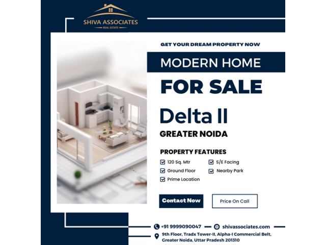 Shiva Associates presents a modern home for sale in Delta II, Greater Noida. This 120 sq. mtr. ground floor property is Southeast-facing, located in a prime area, and near a park. Perfect for a comfortable lifestyle!