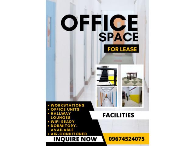 Located in a peaceful environment in Cubi, Subic Bay Freeport Zone, your new office has1. workstations2. hallway lounges2. AC units 3. internetBuilding Facilities:1. Canteen2. Badminton/ Volleyball CourtNeigboring facilities1. Airport2. Aviation Schools3. Swimming pool4. Church5. Convenience store6. Fire Station Contact 09674524075 for inquiries.