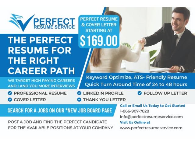 "Order your Resume today with Perfect Resume Service. We have 21 years of resume writing experience and a 100% satisfaction guarantee from our customers. Perfect Resume Service will assist you in writing a professional resume, we will help you decide what to include and what to remove from your resume. We can also help you craft the Perfect Resume, Cover Letter, LinkedIn profile, Custom Resume Designs and Thank you letter to give you an edge over the field of candidates when applying for a job. We will scan your new resume to ensure ATS compatibility and higher job match rates and land more interview opportunities. Quick Turnaround time available 24 to 48 hour
