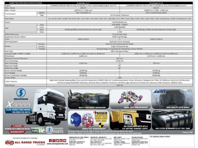 Shacman X3000 11-liter CUMMINS ISM CELECT 6-cylinder turbocharged Euro-4 Diesel engine, 385 horsepower, 1, 825 N-m torque, 12-speed manual transmission, 6-wheeler 4x2 rear wheel drive, 600 liter aluminum fuel tank, 430 mm diameter EATON clutch, SHACMAN-Hande Axles, 12R22.5 (10 1) tires with rim trim cover, multi-leaf spring suspension, WABCO braking technology, length: 6, 825 mm, width: 2, 490 mm, height: 4, 000 mm, wheelbase: 3, 175 mm 1, 400 mm, Gross Vehicle Weight: 18, 000 kgs, Curb Weight: 9, 500 kgs, Gross Combination Weight: 40, 000 kgs, high roof, double sleeping beds, four-point air suspension, air conditioning system, Grammer air suspension driver seat, HID headlamps with Adaptive Front Lighting System with LED Daytime Running Lamps, Jost fifth wheel, Cruise Control, Fleetguard air filter, electrical cab reversal, central door locks, electric heater side mirrors, SHACMAN telematics; 12-months unlimited mileage new vehicle warranty.